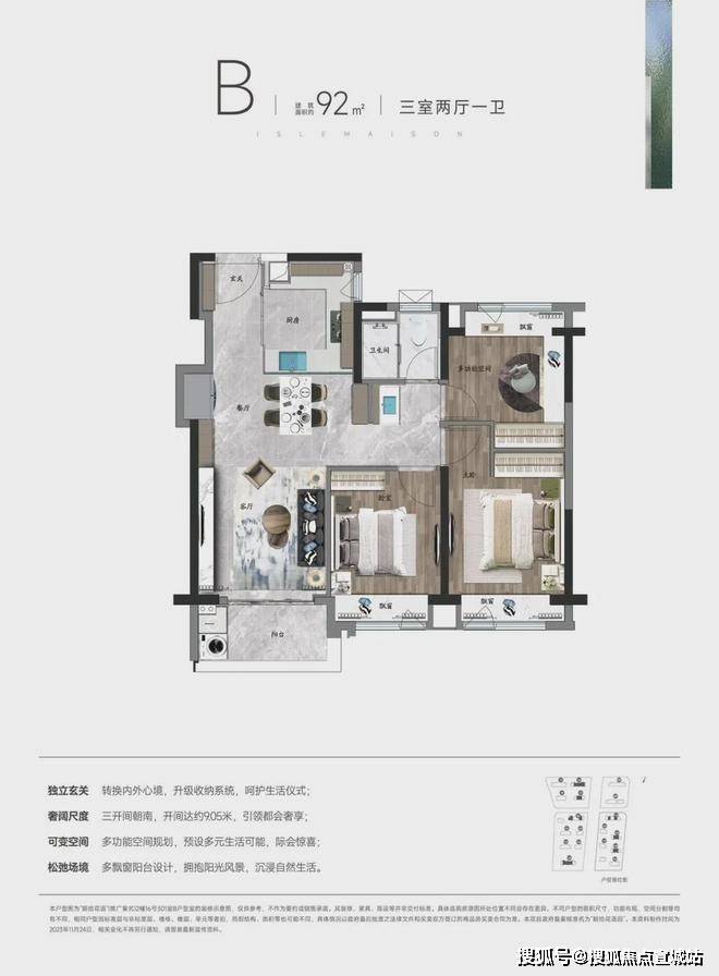 ④多变空间:三室朝南,动静分离,北房间灵活可变,满足不同家庭居住需求
