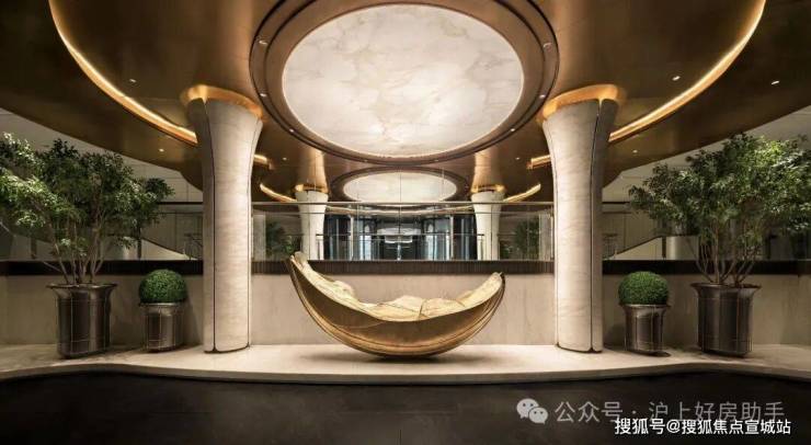 一汪深邃的「宇宙之心」漩涡水景,灵感源自梵蒂冈博物馆举世闻名的双螺旋楼梯,模仿宇宙星系流转的宏大景象,纳藏天地万物生生不息的力量。