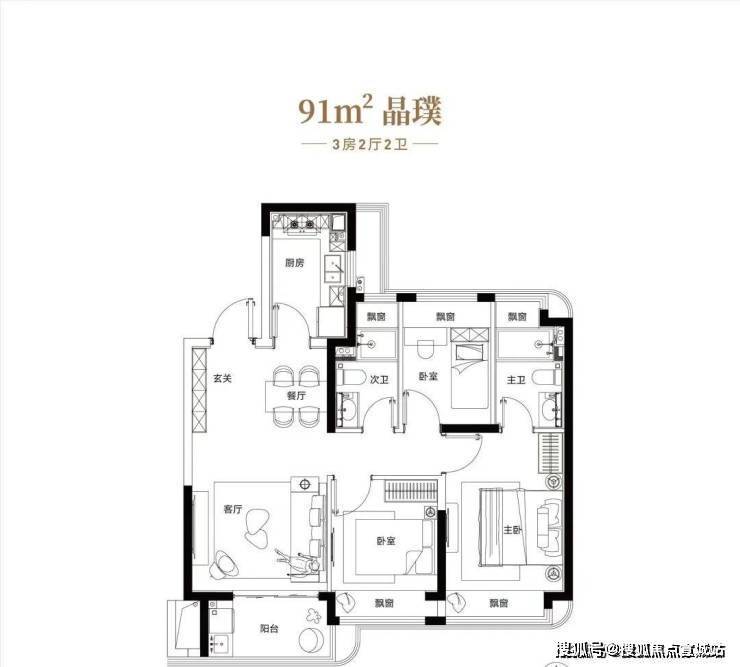 约91平3房户型,餐客厅一体,主卧套间,全屋飘窗,功能齐全。