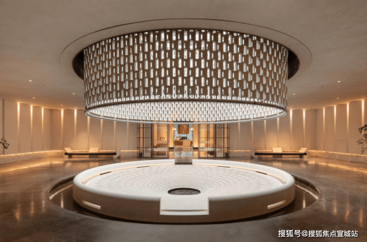 浮光池院水院会客厅,现已实景呈现,水景中央的艺术小品,如一滴水在湖面晕开,泛起阵阵涟漪。
