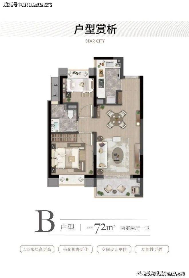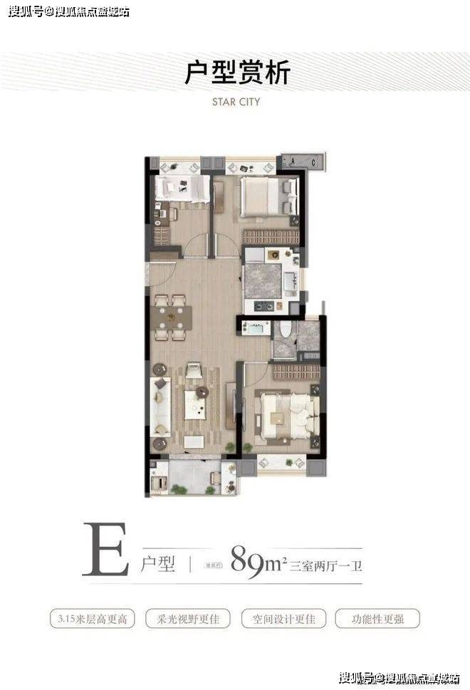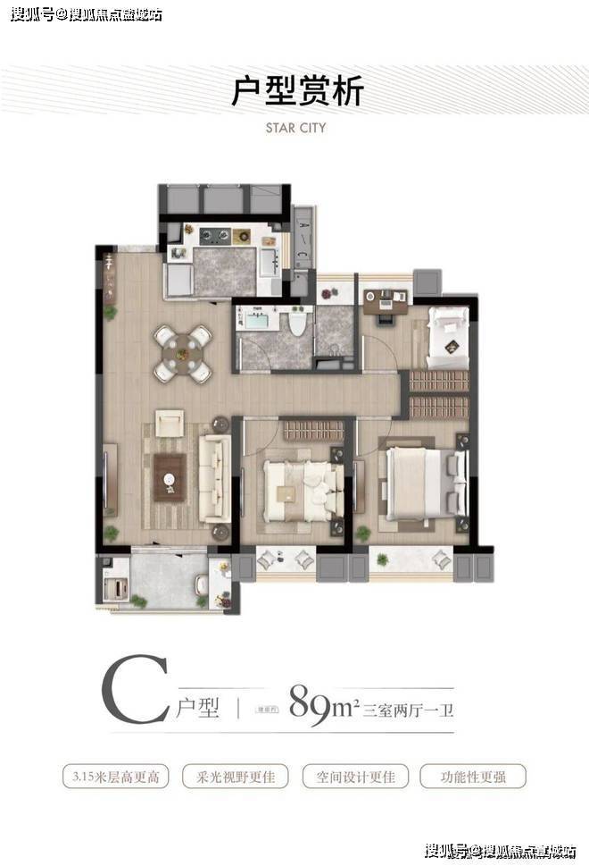 约89㎡户型:大虹桥范围不到90㎡的户型大部分都只做到2房,灿耀星城该面积段实现3房功能性,让自住客户一步到位,也让该产品进入二手市场后具备降维打击的优势!