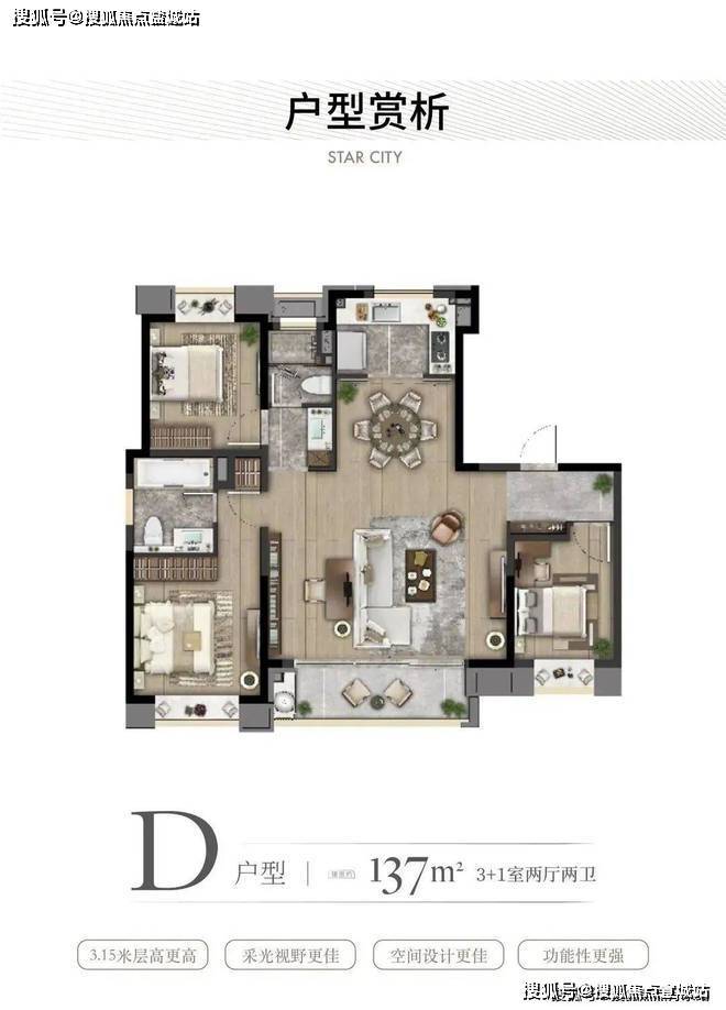 灿耀星城预约热线:400-902-3966☎约137㎡户型:格局上做到了三开间朝南+南北通透,大尺度的奢阔横厅设计串联南向观景大阳台,整个公区的视野无比通透;主卧套房,保证了业主的尊崇感和私密性!装修标准:室内三大件(地暖、新风、日立中央空调)厨房三大件(末端净水、老板洗碗机、油烟机)电动晾衣架,ToTo智能马桶等。