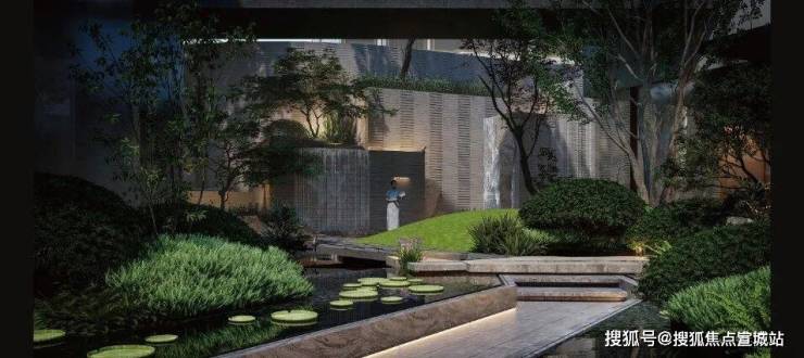 中央水韵庭院以「叠水莲池」为理念打造多层次的水景体系,叠水瀑布形成动态的水流韵律,池畔大理石打造的休憩长桌,成为被绿意环抱的林下空间,氛围相当惬意~