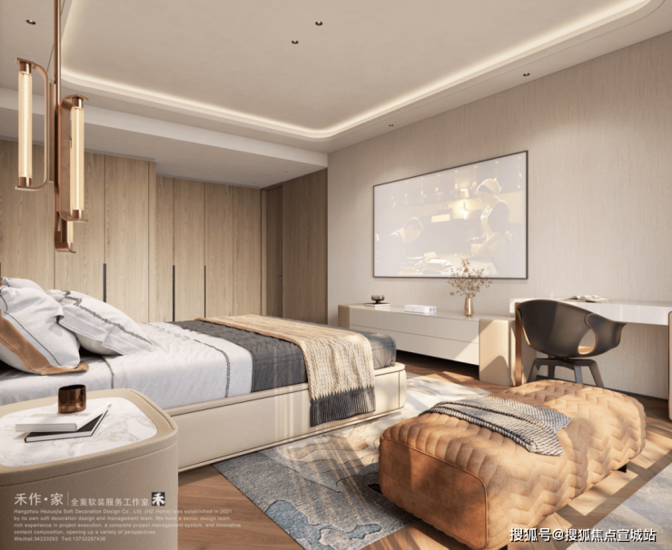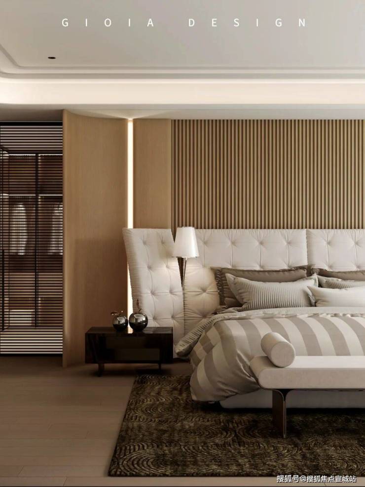 主卧中,VisionnaireRipley床架以低调奢华诠释休憩美学。深灰色真皮面料带着荔枝纹肌理,床头绗缝工艺暗藏对称美学,金属嵌条如精致腰带勾勒轮廓,与硬装艺术玻璃形成呼应。两侧悬浮床头柜轻盈悬空,玻璃台面与金属支架透着现代气息,柔和灯光洒在床品上,营造静谧安稳的睡眠氛围。