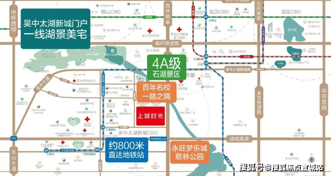 交通配套:以西环南延、吴中大道快速路为依托,交通便捷,在建的地铁 7 号线串联苏州各大区域,周边直线 2km 范围内共有 4 个地铁站,1km 内有 15 个公交站。