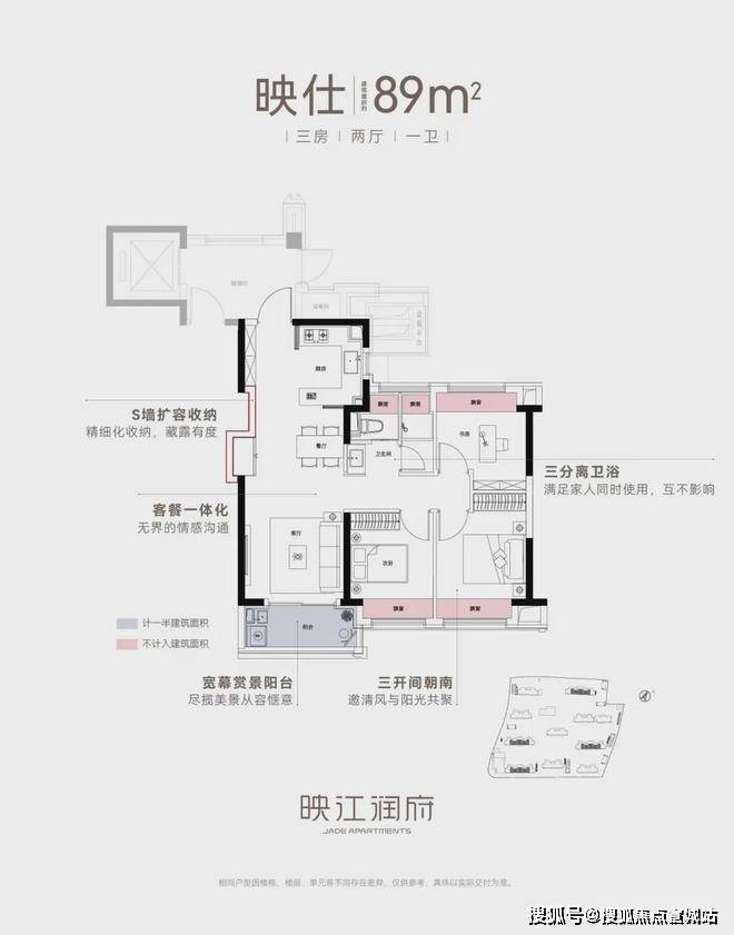主力户型:建面约 89㎡三房两厅一卫、103㎡三房两厅两卫。