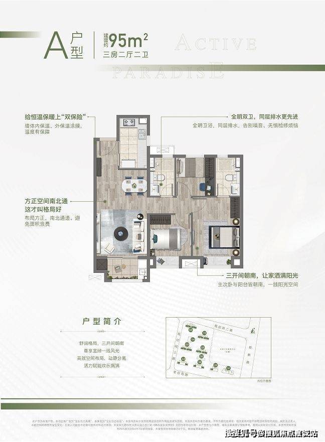 1、约95㎡的三房,南北通透,全明设计,三开间朝南,户型方正。