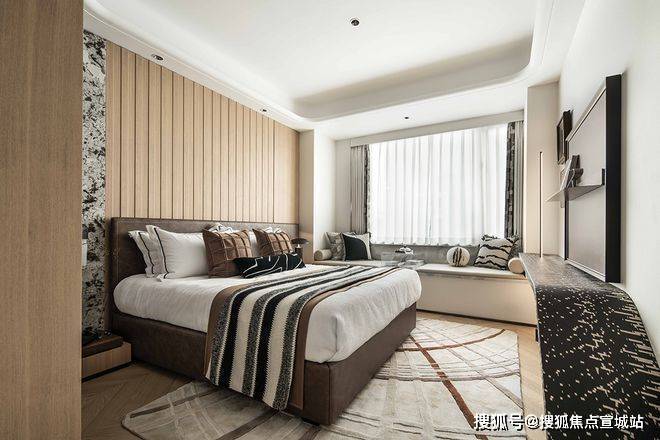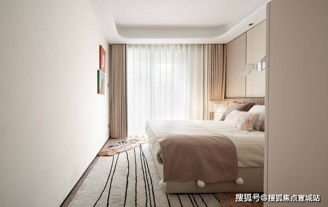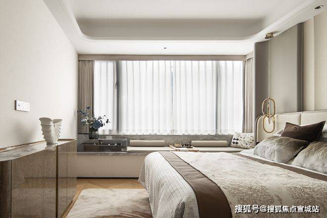 主卧聚焦居住者心里层面的私密感受。将不必要的元素剔除,留下简柔色块,柔和的光线和质感细腻的材质,使整个卧室显得温馨而舒适。床前的绿植和窗边的阅读角,为居住者提供了一个放松心灵的角落。