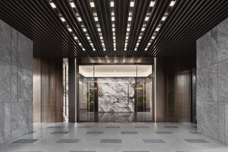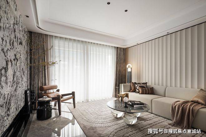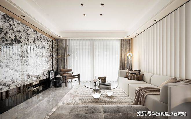 设计的主题元素来自于富春江水的气韵与形态,整体以素雅色调为主,儒雅,淡然。天然奢石“雪山飞狐”的运用,增添艺术氛围的同时,也使得视觉更具层次。