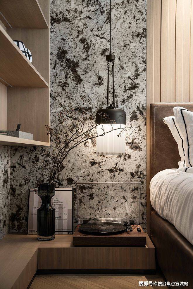 次卧的色调稍暗,在不同材质的线条下,显得安宁而祥和。