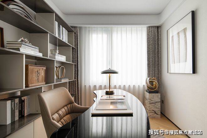 书房将专注工作的理想场所具像化,安稳,妥帖。深木色的主调和简约的家具,空间显得宁静而严肃。墙面的装饰画增加了一丝生气,使工作变得不再枯燥。