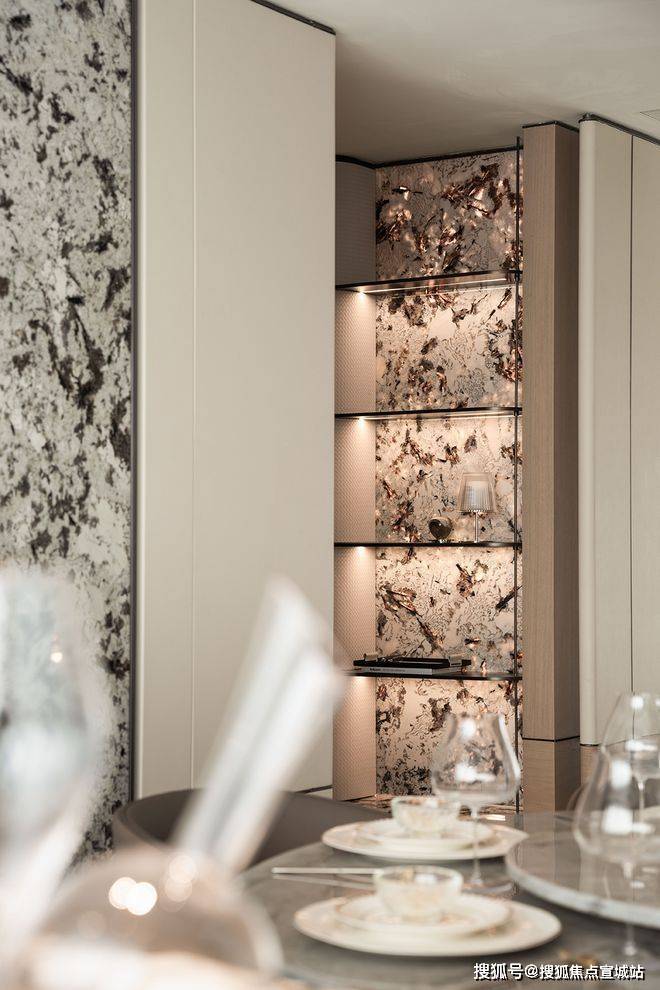 厨房玻璃平推门的半开放式设计,开合之中,是独立操作和共同享乐间的情绪转化。细节上,边台和墙面局部延续水墨纹理石材的语境,维持了家居色调统一。