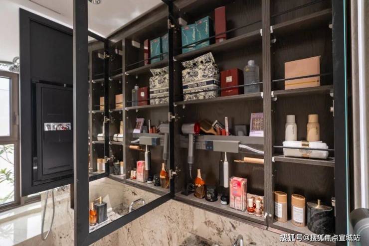 眼前一亮的是卫生间收纳,项目的镜柜是内外双镜,并且内部的收纳空间相当丰富,小到女主人的发箍、面膜、口红、香水,大到吹风机都有适合的位置。