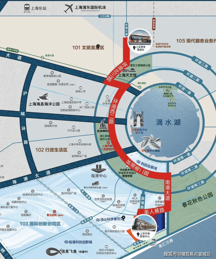 约14.3公顷的莫比乌斯公园是103片区内最核心、面积最大的公园。打造滴水湖首个大型体育场馆,项目东邻赤风港湿地中心,南面朝向大海周边有南汇新城城市公园、国家风景区滴水湖公园,春花秋色公园。