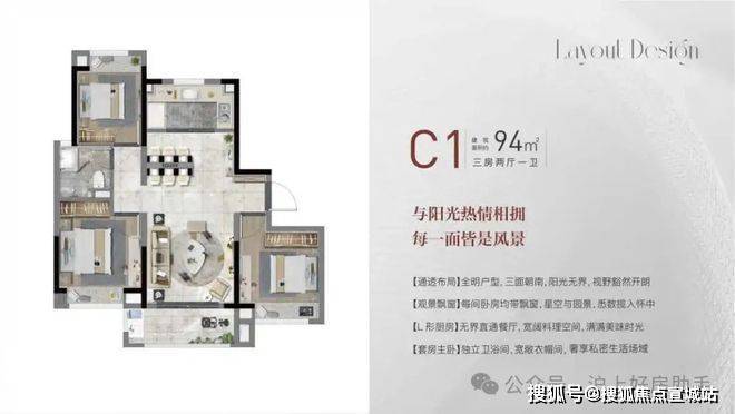 建面约99㎡3房2厅2卫,做到了三开间朝南+动静分离+南北通透+双卧室朝南+主卧套房设计+明厨明卫,室内通透明亮。