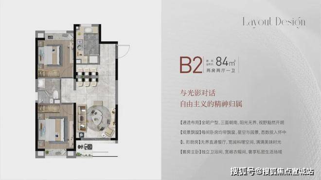 建面约84㎡2房2厅1卫,做到了双开间朝南+双卧室带飘窗+动静分离,非常宽敞的2房户型。