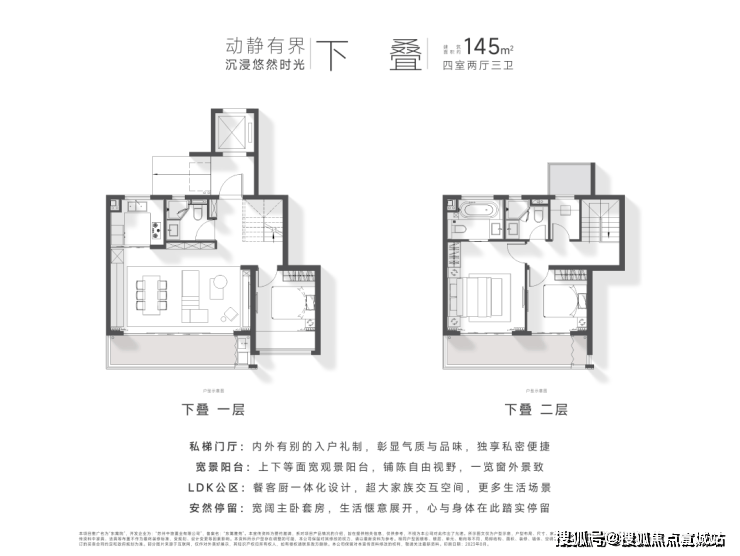 定制空间:全横厅设计、LDK多功能家庭区;功能间配置+灵动空间设置;建面约135㎡以上户型,全3卫配置,居住品质更高。