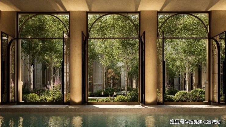 NO.8花园泳池波光潋滟处,拱形门窗外花影摇曳,一池春水将四季芳菲溶成流动的油画。