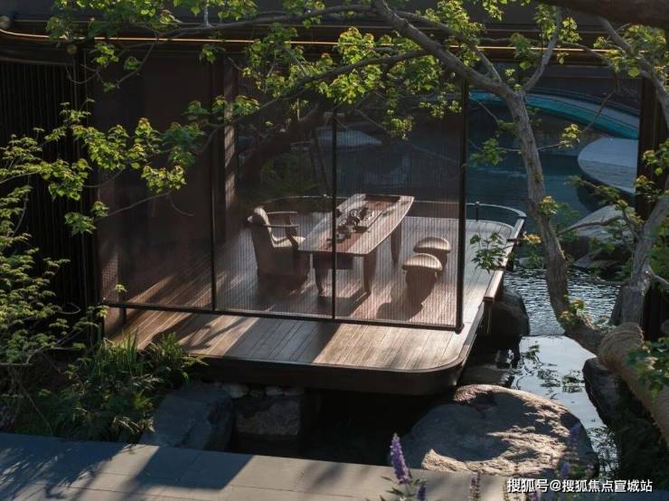 “在朗云的园林世界里,从一个房子到另一个房子,只有20多米。但却要翻过一座山瀑,穿过一片林,跨过一座桥,林中的溪流之上落着一个水轩。坐在里面可以倚着树隔着岛望向对岸的房子,这期间距离很近,游历很远,在游历山水中让人忘却了时间,享受山水。这也是苏州古典园林穿越时空放下形式带给我们的诗意——小中见大”。