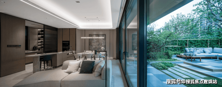 买合院一定要看「院房比」。展示区的这套约207㎡样板房,就有一个约80㎡的超大庭院。要知道,一套约200㎡的高层,客餐厅的大公区通常做到约50㎡,已经是很大尺度。但是,莳花弄草、饲鸟养鱼的优哉游哉,只有在合院的私家花园里才能实现。