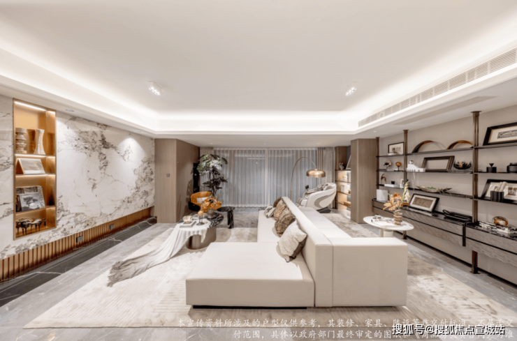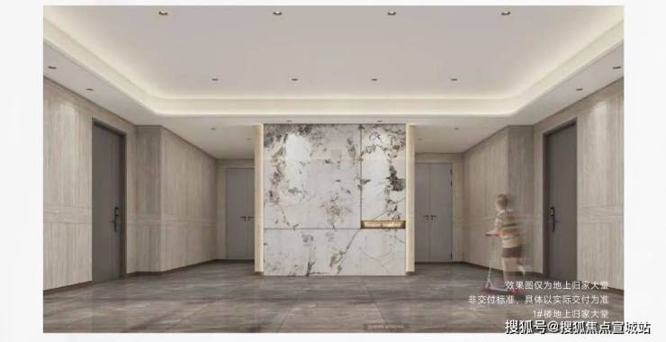 注重归家的仪式感,更重视心灵的归藏,奢装地上入户大堂,公区墙面地面均采用仿石材墙砖,大堂主背景采用仿石材岩板,搭配古铜色不锈钢踢脚线收口线,营造尊崇的入户体验,彰显奢宅生活主张。