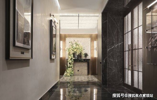 项目打造全石材双归家大堂,入户大堂地面大面积香格里拉黑大理石,墙面配奥特曼米黄石材、莫奈花园大理石,电梯轿厢部分墙面还用上了冷翡翠,会所地面泫雅棕大理石、威尼斯棕大理石局部背景面。