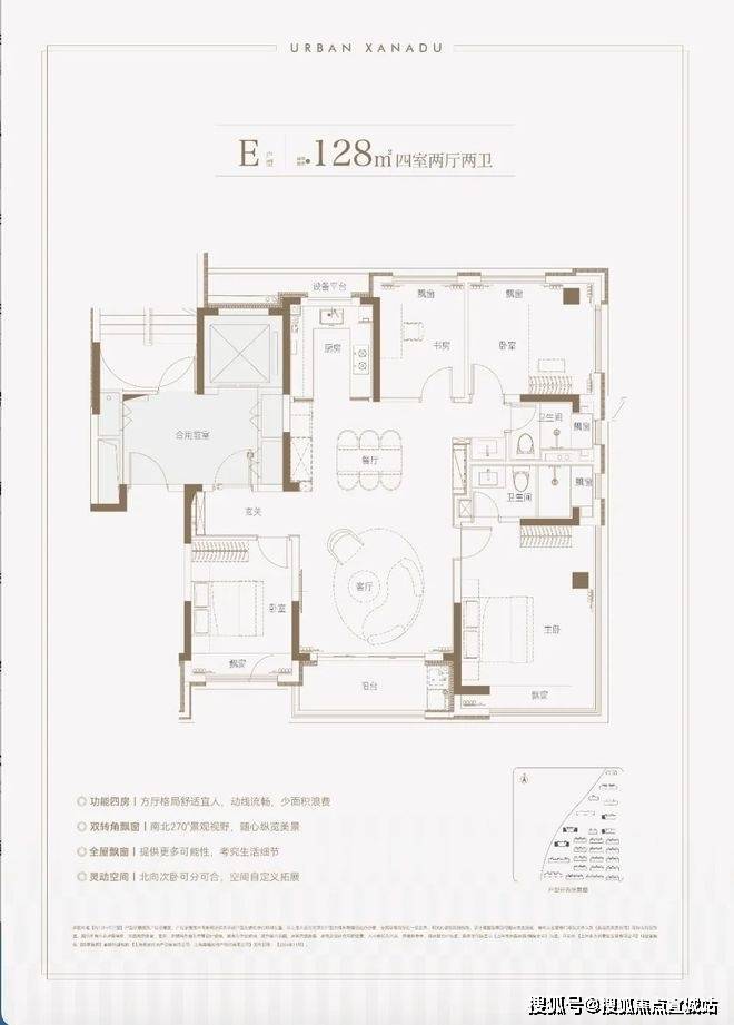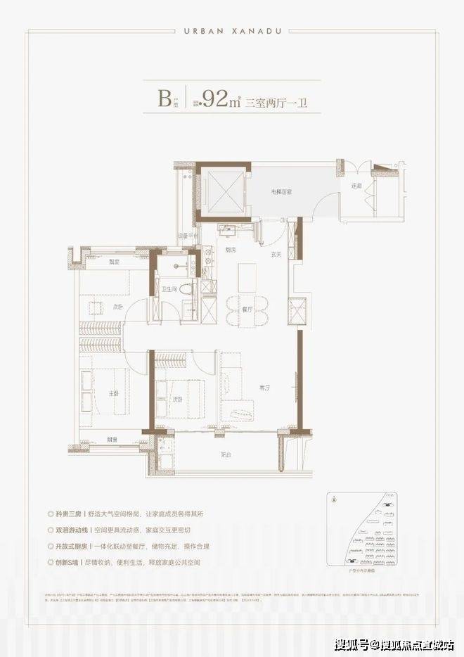 户型规划:主力户型为建面约92-143㎡的3-4房,边套户型设计270°广角窗面,优化采光与视野