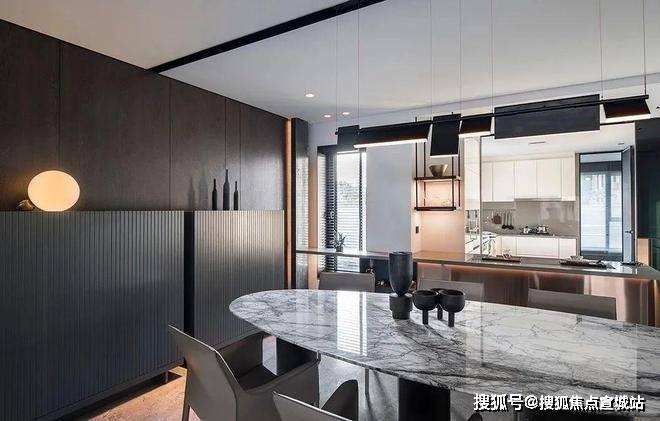 开放式厨房,一体化联动至餐厅,岛台台面为岩板,巧妙地与餐厅融为一体。