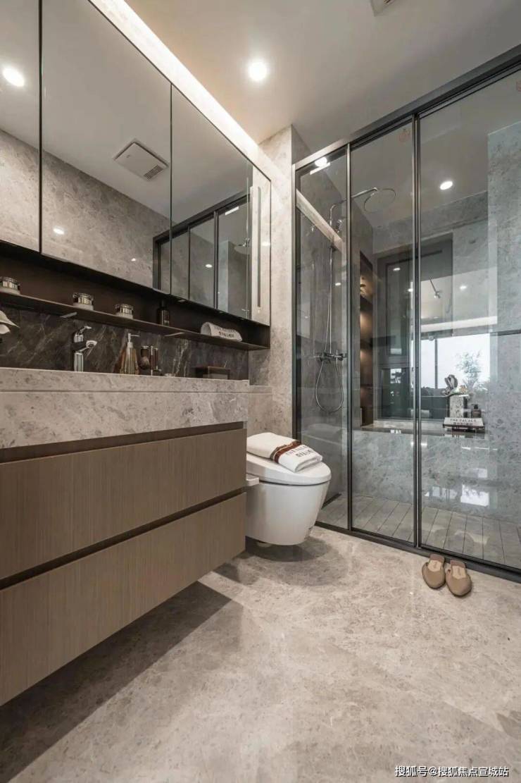 卫浴空间同样精彩,采用 高仪的台盆、龙头、智能马桶、淋浴花洒等,主卫创新定制“美妆冰箱”,满足业主对美妆、护肤用品冷藏的需求,足见开发商对成本的舍得。