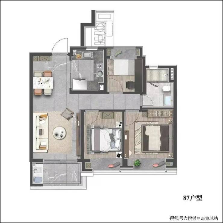 建面约87㎡3房,做到了三开间朝南设计,整个户型几乎没有浪费面积。实现空间节约、居住升级等美好体验。