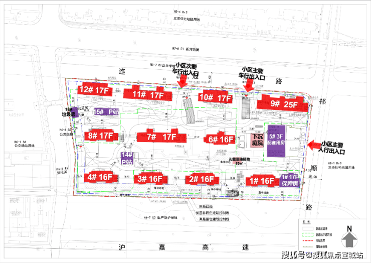 根据项目设计方案显示, 拟建11栋16-25层高层住宅。其中1号楼靠近17层的保障房,5号口为3层的配套用房,14#、15#为P站,16#为垃圾用房。