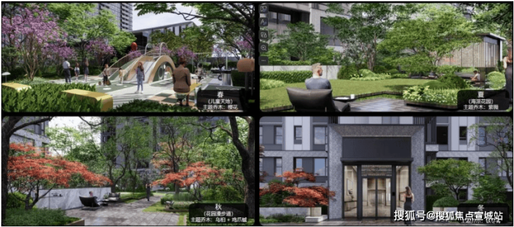 多花园:沿归家轴线设计了悠闲童梦花园·、静谧私语花园、精致乐享花园、邻里会客花园、活力健身花园等。花园种植了像金桂、红梅、晚樱、榔榆等植被,常绿与落叶植物组合搭配,三季有花,四季有景。