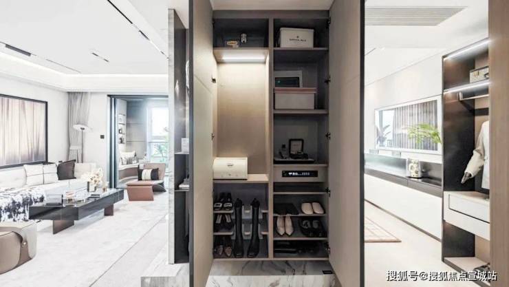 入户后,所有玄关柜均为交付标准,还精心配置了 “除臭精灵”,下方更 预留了扫地机器人的空间,为日常起居提供便利;像传统的豪宅三大件,项目采用 大金品牌中央空调地暖两联供,以及 格兰斯柯的新风。