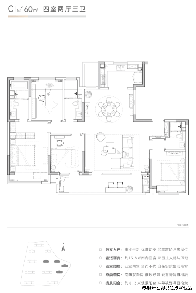 主力户型:有 122㎡三居、132㎡四居、160㎡四居,得房率 78%-82%。