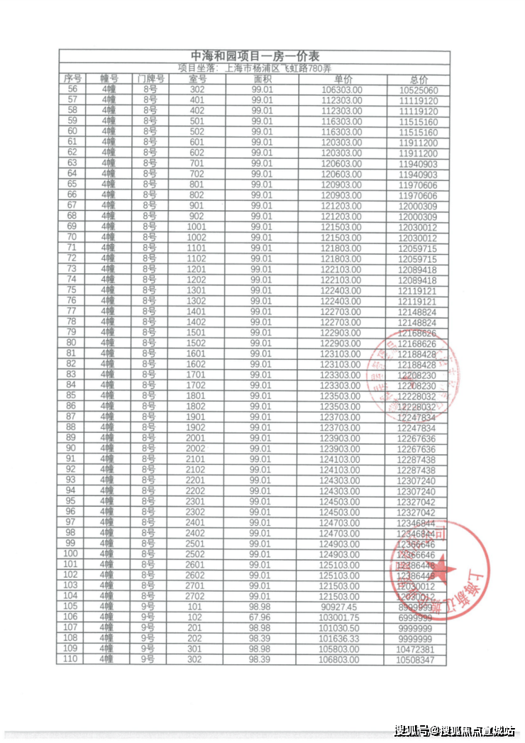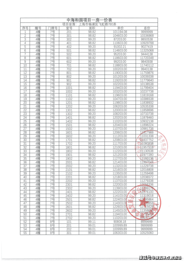 一房一价表如下