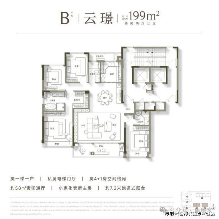 高层均为建面约199㎡的大平层户型,极致纯粹的业主圈层,带来更为尊贵的居住体验。其户型设计尽可能扩宽南向开间的同时,展现出了极为阔绰的空间尺度,足以满足多代同堂的居住需求,成为众多购房家庭终极改善的首选。