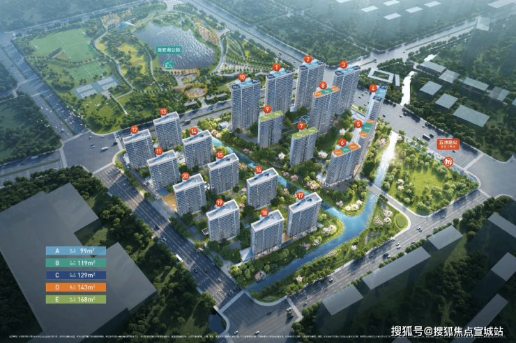 3.环幕滨水住区:北望区域最大且功能性齐全的龙安湖公园,板块内唯一带沙滩的公园,南邻滨水绿地,园区“T”形水系贯穿
