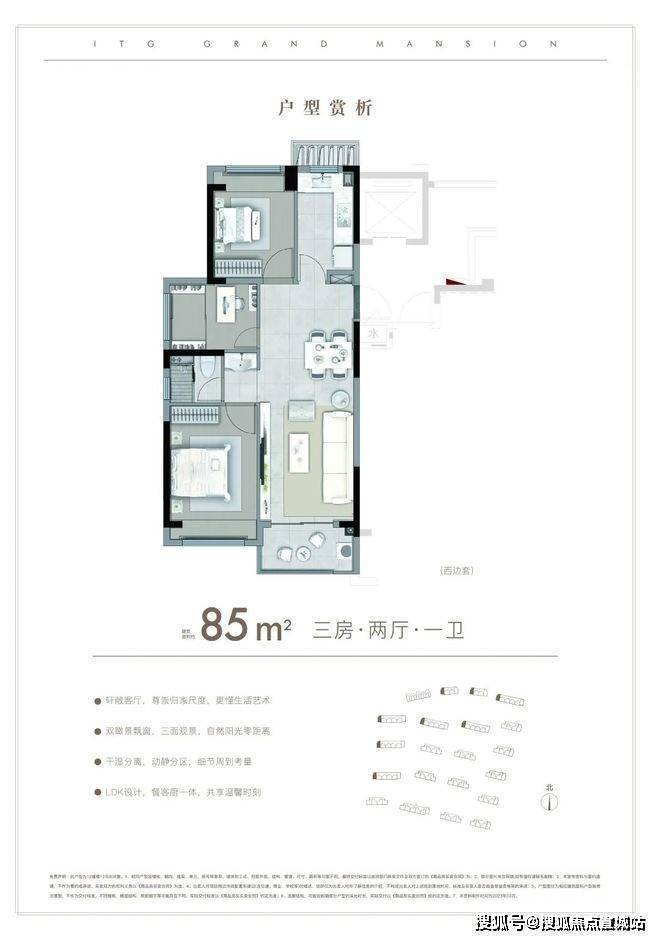 户型解析:约85㎡的3房,这种入门级的产品也要保证居住的尺度感。比如利用L形厨房与餐厅相连接,一体化的设计让空间充足利用。比如次卧连接阳台,就是人性化考虑到给他们一个私密的追光天地。