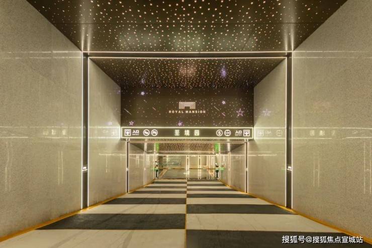 超5000个孔洞的全铝板星空穹顶,是你回家的第一眼浪漫。坡道两侧,选用天然高端花岗岩,内嵌一排整齐有序且镶嵌灯光的铝合金LOGO墙,搭配黑白琴键的止滑坡道,一起铺陈出漫漫“星光大道”。