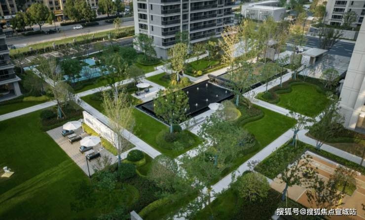 对于社区的每一处户外空间,我们都在定位一个“圈层”。我们都在打造一个“生活的秀场”,激发户主出户的欲望。场地内水与树交辉相映,消除周边建筑的压迫感,融入更多自然的元素,让居者在户外交流的过程中仿佛置身林间,回归自然。