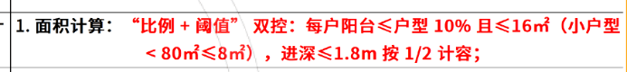 老规产品因为设计局限得房率非常低,这里我们就不多赘述。新规虽然通过放松阳台增加了实得率,但还是对阳台面积实行了“比例+阈值”双控,把阳台面积能做多大规定死了。