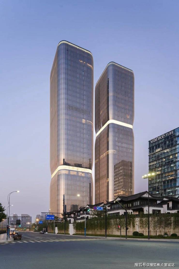 外观设计:双子塔地标设计,高约 150 米,由全球顶尖建筑事务所 Aedas 操刀,外立面以 “绿荷舒卷” 为灵感,弧形雨棚与钱塘江波光形成美学共鸣,荣获 “CTBUH 2024 全球最佳高层建筑奖(100-199 米)”。