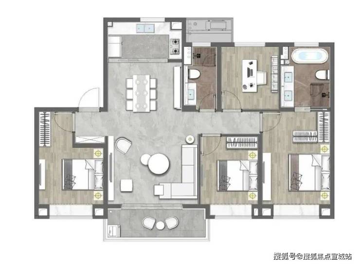 该户型做到了三开间朝南+超大面宽横厅+主卧套房设计+卫生间干湿分离+南北通透,功能性和尺度感完美结合。