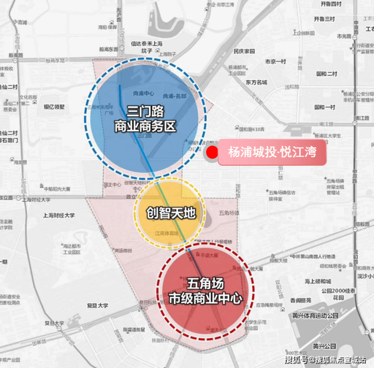 江湾五角场城市副中心分为三大片区:南部是商业中心、科教商务区,中部是知识创新中央社区,北部是高端知识商务中心。