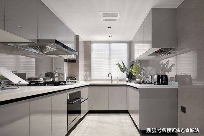 厨房空间,采用铝合金玻璃PVC饰面的免漆门套及铝合金移门,三件套使用 老板的油烟机、燃气灶、洗碗机交付,更有摩恩的水槽和龙头、定制的组合橱柜。