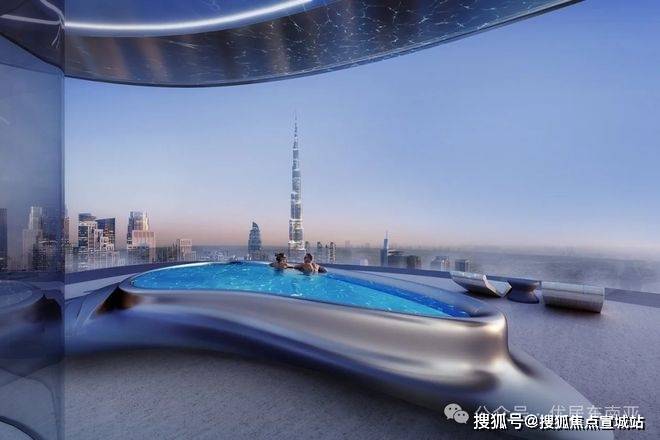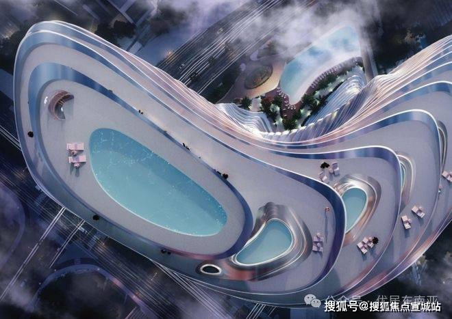 高层和顶层的泳池巧妙地错落布置,高耸在云端,仿佛犹如天宫瑶池一般令人留连忘返。泳池的材料展现出鲜明的金属质感,似乎与地面完美融合,消除了边界感,营造出一种无限延展的视觉效果。