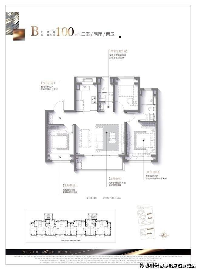 建面约100㎡的三房两厅两卫户型,可以说是约96㎡3房的升级版,空间更加延展,整体横厅面宽约5.2米(轴中距),形成更大的南向采光面,且搭配南向观景阳台,直接做到了3.5面宽朝南,这在同类产品中是比较少见的。