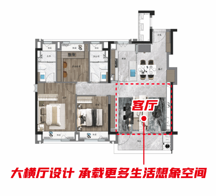 并且大横厅+超大的阳台+客餐厅一体化,可以实现业主更多的生活场景。