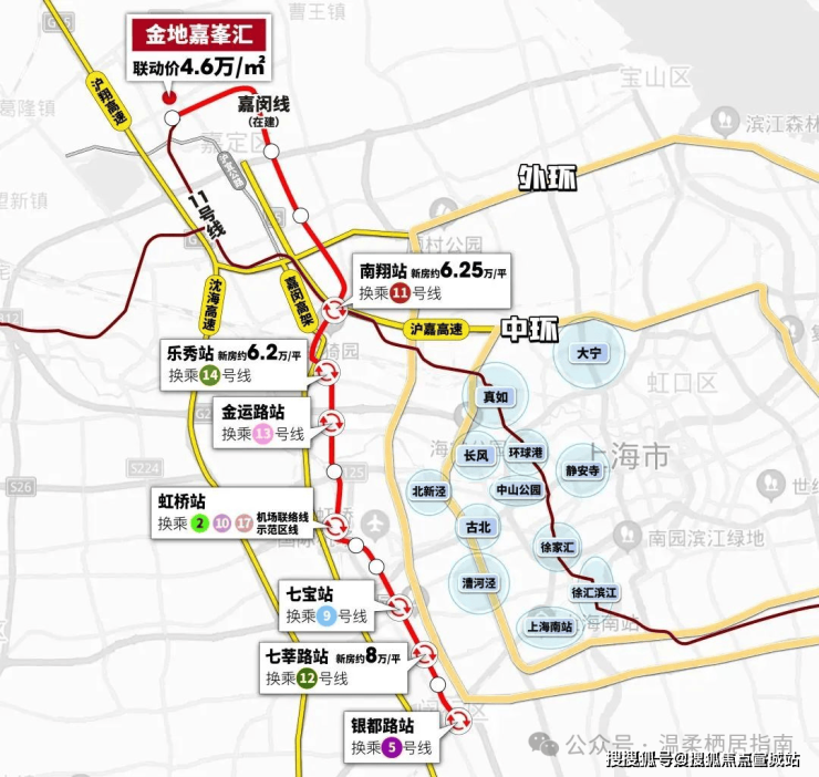 直线距离约200米嘉闵线(在建),8站直达大虹桥,连接七宝、莘庄等多个CBD,不论是上下班、聚会、商务出差等都十分便捷。另外值得一提的是沿线新盘均价均在6-8万区间,其中约350万总价的潜力盘或许只有金地嘉峯汇!