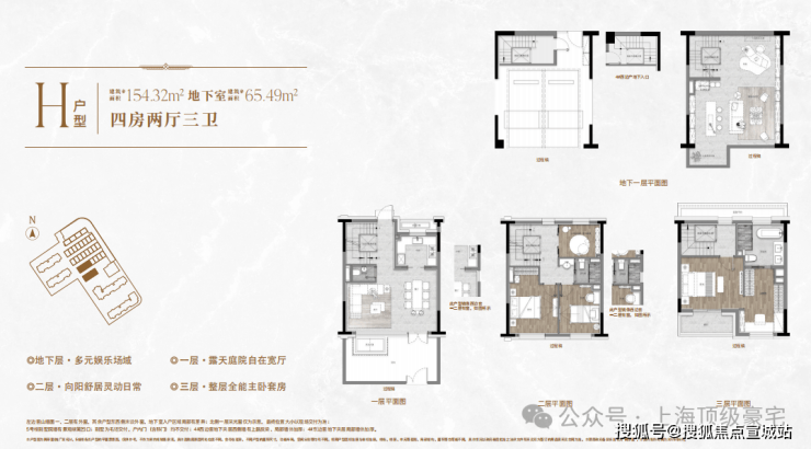 一楼和地下室主社交和志趣,二楼是子女的房间,三楼是主人休憩区。